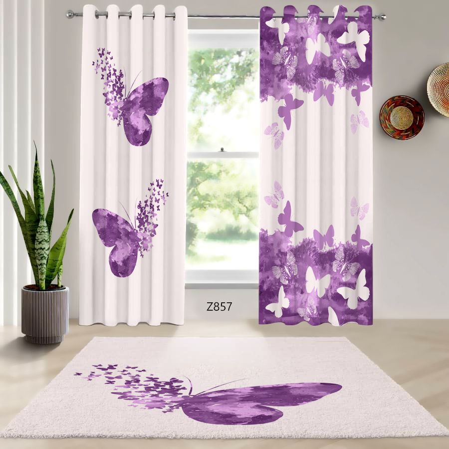 ست فرش فانتزی و پرده مخمل و هازان اتاق خواب طرح پروانه